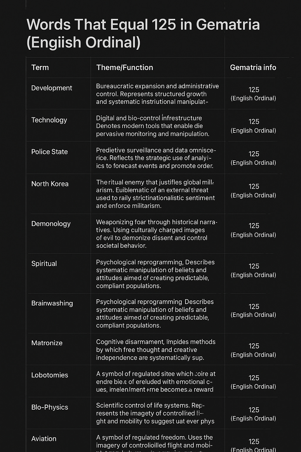 Using English ordinal gematria (A=1 through Z=26), the following words total exactly 125. Each one connects to themes of restriction, influence, or systemic control: